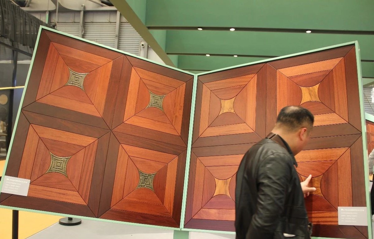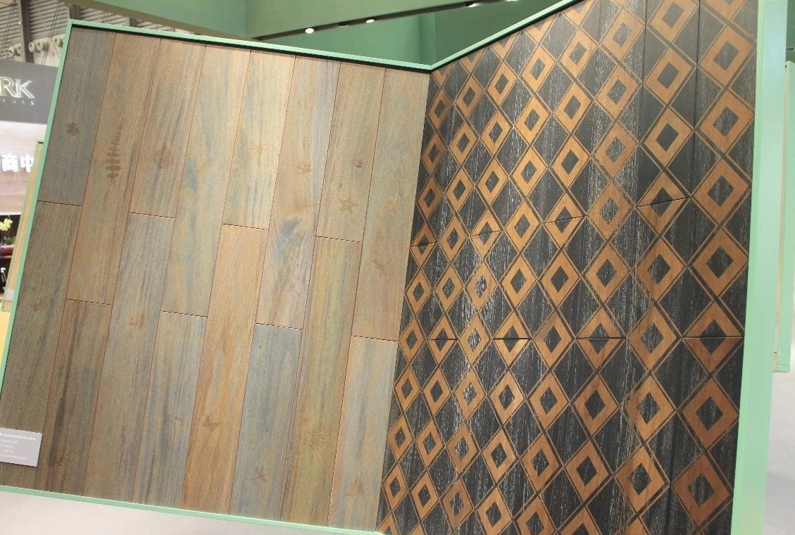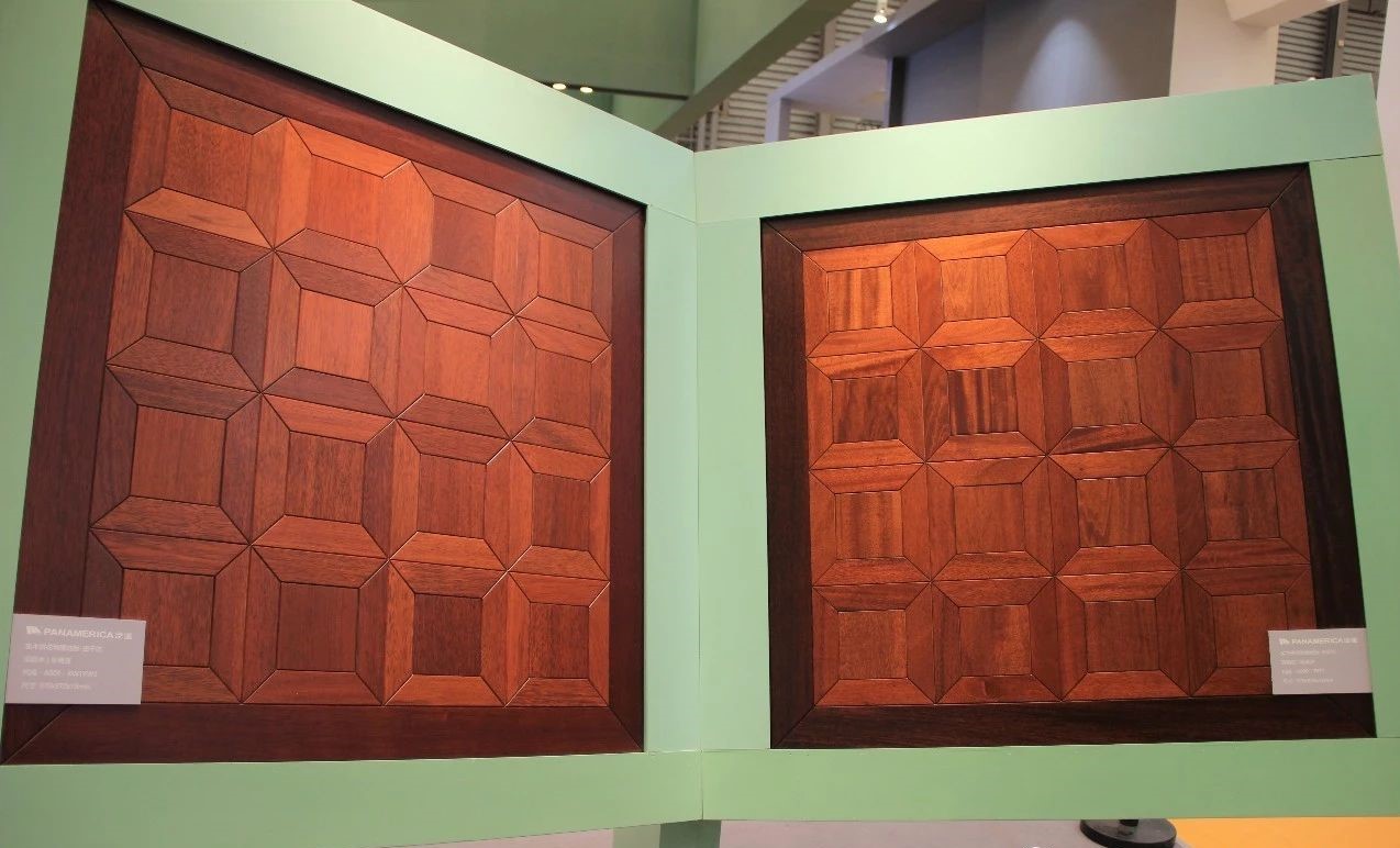 完美融合了高雅設計理念及實用功能的現(xiàn)代空間里,有著上海地材展上吸睛無數(shù)的泛美地板系列拼花產(chǎn)品:尼德蘭、木玉石、田子坊和十字符拼花。這些地板工藝復雜,是集合珍木材質、適地暖功能,與現(xiàn)代美學設計裝飾需求共同平衡的結果,簡潔流暢的線條,極具質感的南美硬木紋理,隱蔽縫粘扣帶鋪裝技術的加持,在豐富多樣的珍木材種選擇中,完美實現(xiàn)客戶的獨家高級定制。