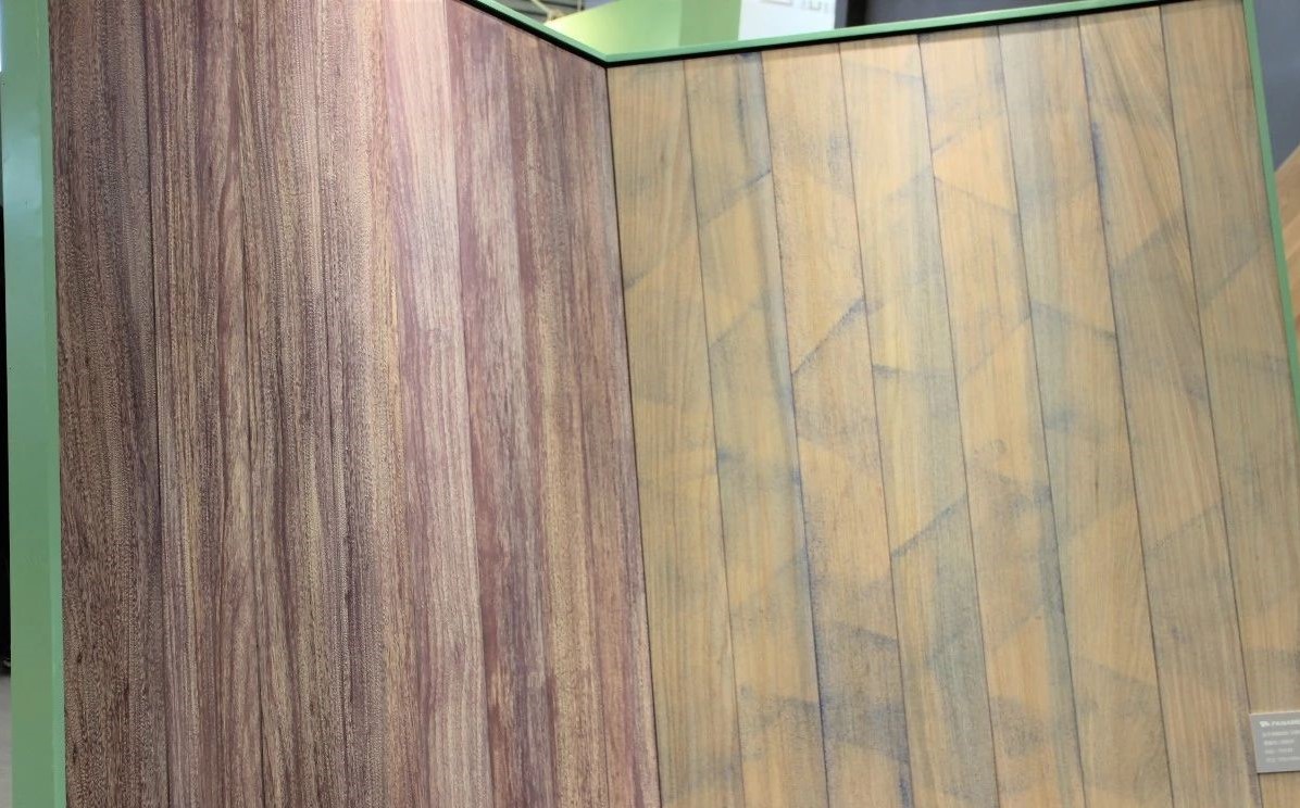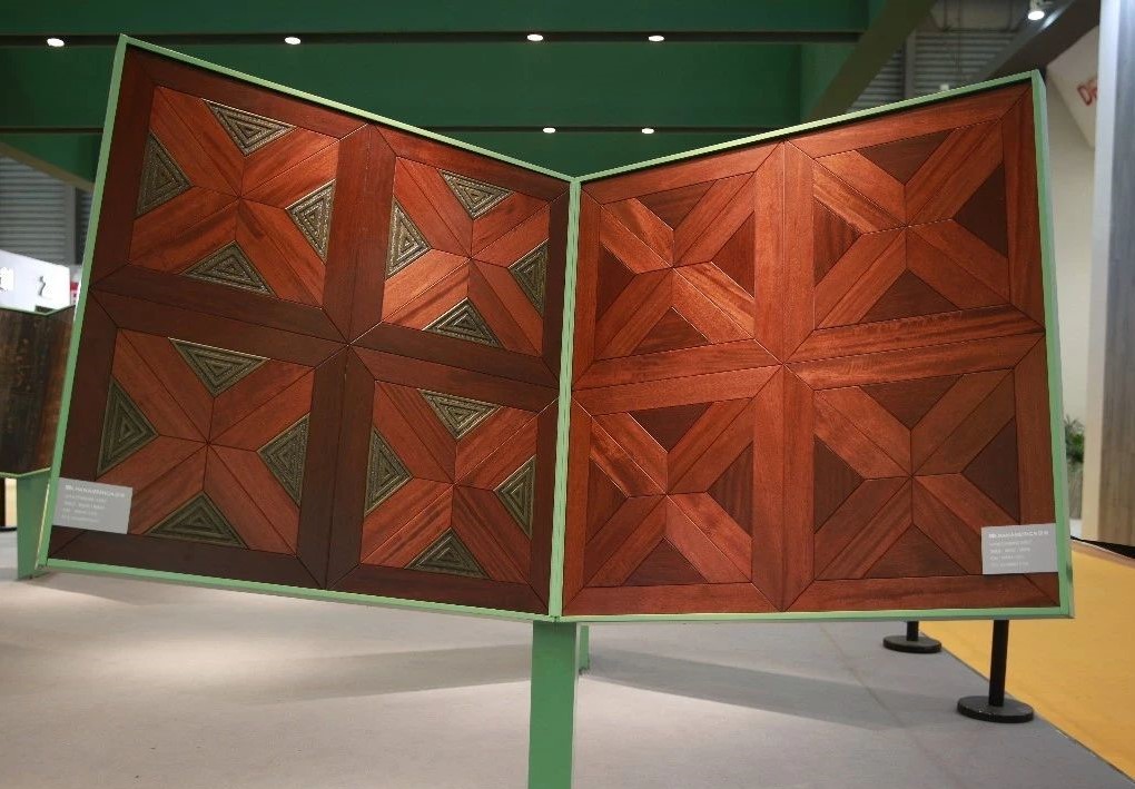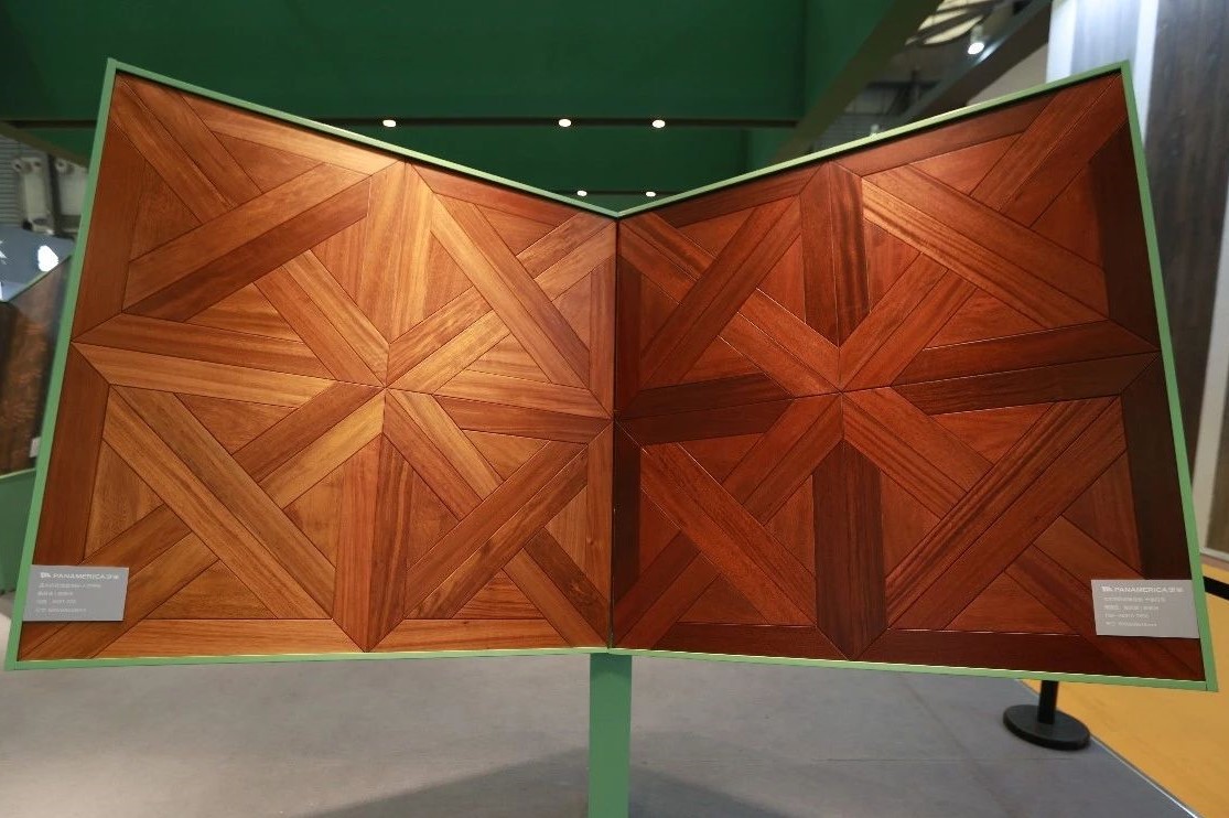完美融合了高雅設計理念及實用功能的現(xiàn)代空間里,有著上海地材展上吸睛無數(shù)的泛美地板系列拼花產(chǎn)品:尼德蘭、木玉石、田子坊和十字符拼花。這些地板工藝復雜,是集合珍木材質、適地暖功能,與現(xiàn)代美學設計裝飾需求共同平衡的結果,簡潔流暢的線條,極具質感的南美硬木紋理,隱蔽縫粘扣帶鋪裝技術的加持,在豐富多樣的珍木材種選擇中,完美實現(xiàn)客戶的獨家高級定制。
